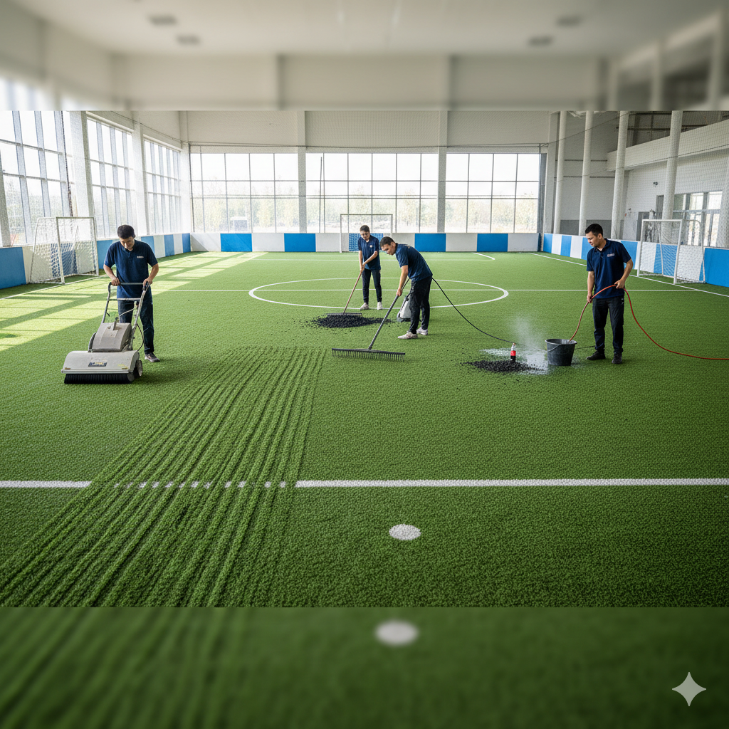 Penataan ulang serat rumput perlu dilakukan secara berkala menggunakan sisir plastik atau sikat mesin khusus. Seiring seringnya lapangan digunakan, serat rumput cenderung akan tidur atau menjadi rata karena tekanan kaki pemain. Dengan menyikatnya secara rutin ke arah yang berlawanan, serat rumput akan kembali berdiri tegak, sehingga tingkat kelenturan dan estetika lapangan tetap terjaga. Hal ini juga membantu mendistribusikan ulang butiran karet (rubber granule) agar tidak menumpuk di satu sisi saja.